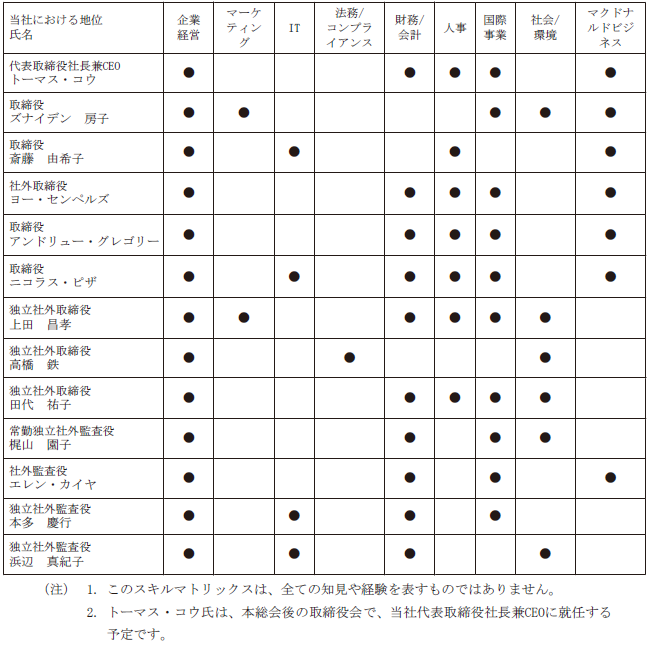 2.アンドリュー・グレゴリー氏及びニコラス・ピザ氏が所属するマクドナルド・コーポレーションと当社の子会社である日本マクドナルド株式会社との間には、ライセンス契約に基づくロイヤルティーの支払等の取引関係があります。ズナイデン房子氏は日本マクドナルド株式会社の取締役、上席執行役員兼チーフ・マーケティング・オフィサー(CMO)を兼務、斎藤由希子氏は日本マクドナルド株式会社取締役、執行役員兼チーフ・ピープル・オフィサー(CPO)を兼務しておりますが、同社は当社100%出資の子会社であるため、特別な利害関係はありません。その他の各取締役候補者と当社との間には、特別な利害関係はありません。