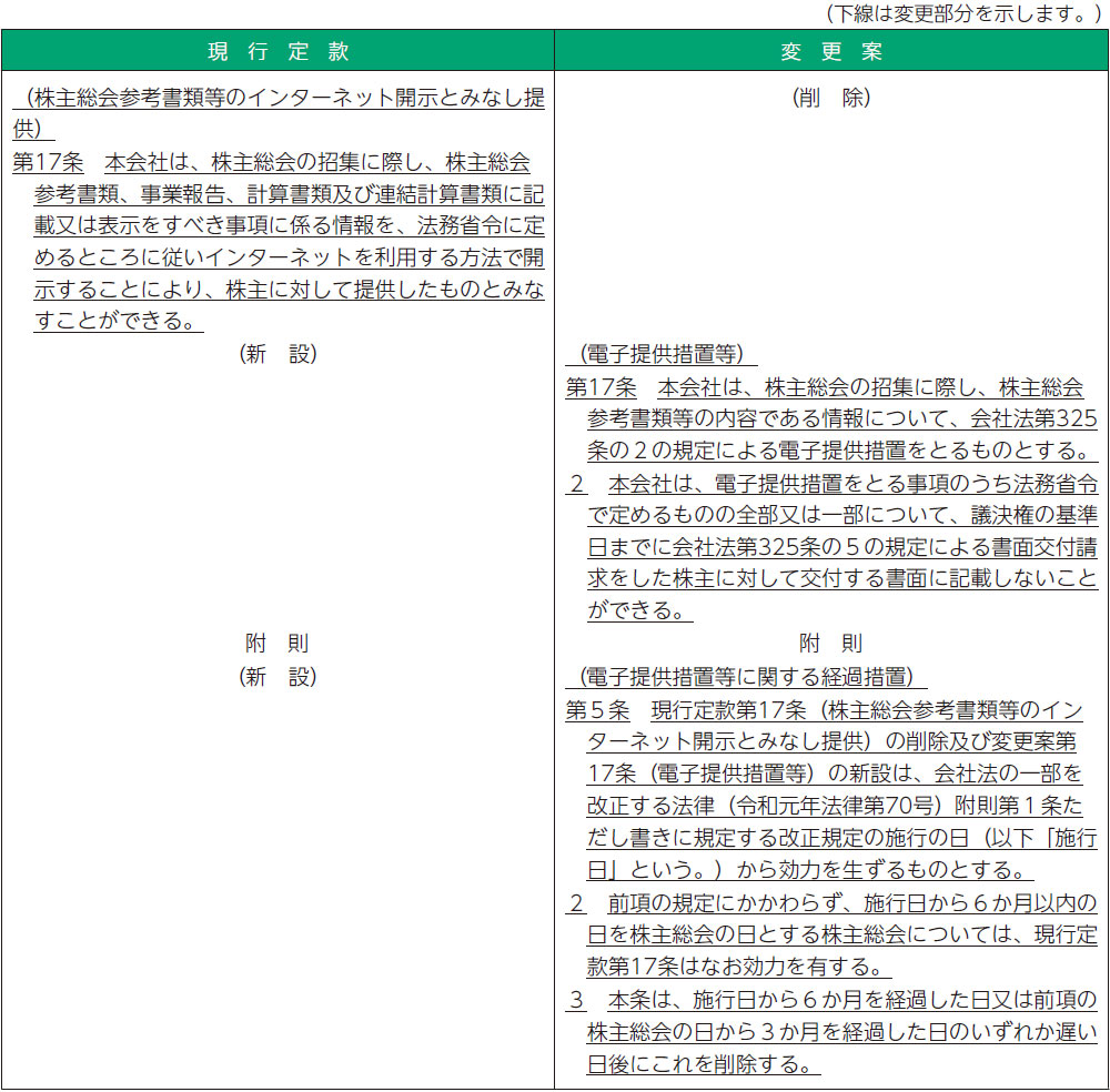 - 変更案第17条第1項は、株主総会参考書類等の内容である情報について、電子提供措置をとる旨を定めるものであります。