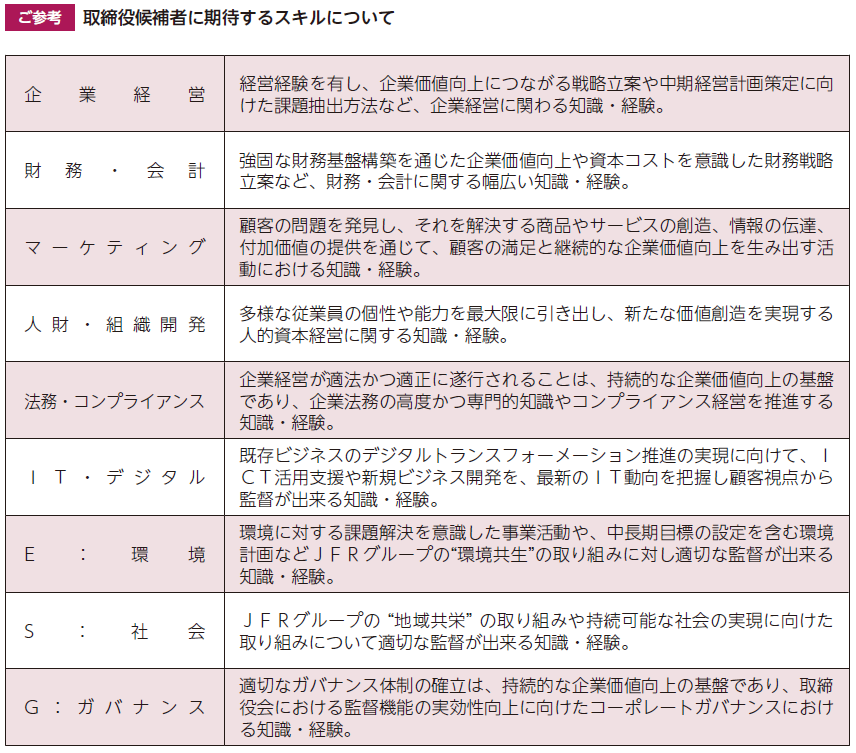 また、社内の非業務執行取締役候補者については、当社グループにおける幅広い実務経験や監査などの知見を有する方を選任しており、執行役を兼務する取締役候補者については、経営トップである代表執行役社長を選任しております。