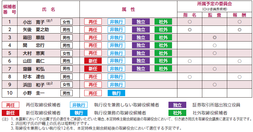本議案の取締役候補者が原案どおり選任されますと、取締役会は独立社外取締役が10名中7名と過半数を占め、かつ女性取締役が3名の体制となり、監督機能の強化と取締役会の多様性の確保に繋がるものと考えております。取締役候補者は以下のとおりであります。