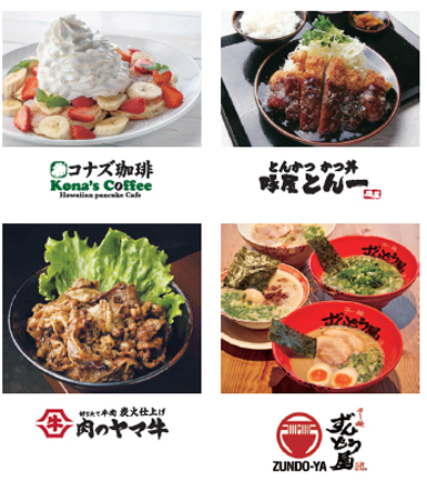 「コナズ珈琲」、「ずんどう屋」、「肉のヤマ牛」、「豚屋とん一」、「晩杯屋」、「とりどーる」、「天ぷらまきの」、「長田本庄軒」、「焼きたてコッペ製パン」が含まれております。