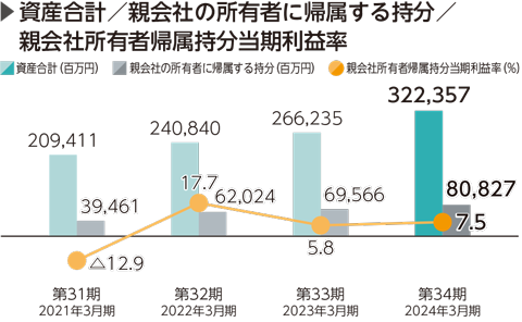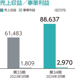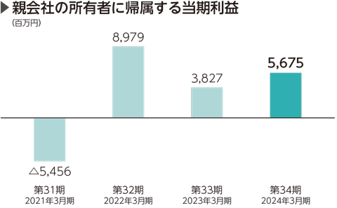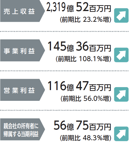 これらの結果、営業利益(注2)は116億47百万円(前期比56.0%増)、親会社の所有者に帰属する当期利益は56億75百万円(前期比48.3%増)となり、共に大幅な増益となりました。