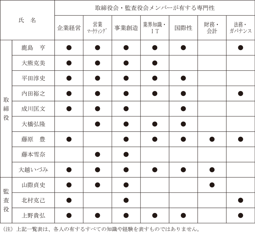 本総会において第2号議案が承認可決された場合の、取締役会・監査役会メンバーのスキルマトリックスは、以下のとおりとなります。