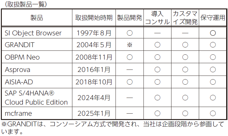 主要な取扱製品は、データベース開発支援ツール「SI Object Browser」シリーズ、プロジェクト管理パッケージ「OBPM Neo」、そしてWeb-ERPパッケージ「GRANDIT」という3つの製品群から構成されています。