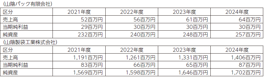 なお、子会社の山陰製袋工業株式会社の当期の業績につきまして、売上高は前期に対して105.7%の1,406百万円となりました。営業利益は前年比128.3%の121百万円、経常利益は前年比128.6%の124百万円、当期純利益は前年比133.5%の87百万円となりました。