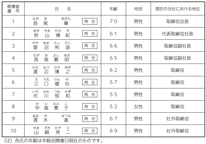本総会終結の時をもって、取締役(監査等委員である取締役を除く。以下、本議案において同じ)11名全員が任期満了となります。つきましては、取締役10名の選任をお願いいたしたいと存じます。