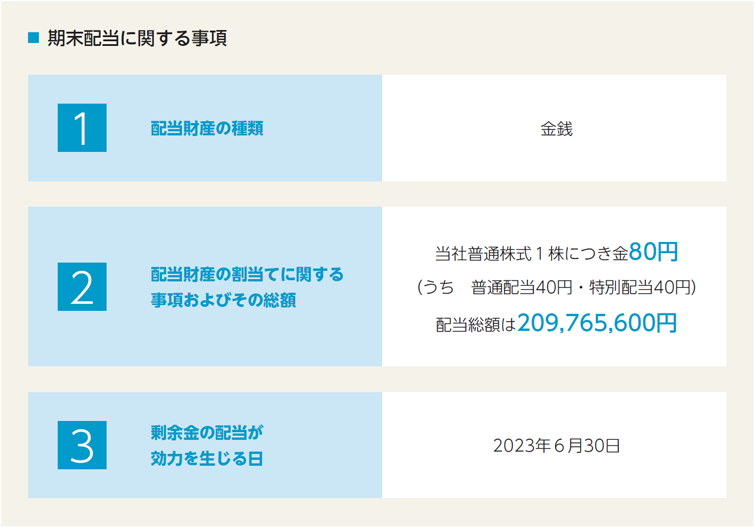 当社は、経営基盤の強化ならびに今後の企業価値向上へ向けた内部留保を確保しつつ、株主の皆様への利益還元を経営の重要課題の一つと考え、安定的かつ継続的に配当することを基本方針としております。また、中期経営計画「TOKYOink 2024」における配当方針として配当性向30%以上を目標とする経営指標を掲げており、 当期の期末配当金額につきましては、上記配当方針および当期業績を鑑み、1株当たり80円(普通配当40円・特別配当40円)といたしたいと存じます。