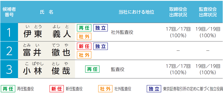 - 伊東義人、富井徹也の両氏は、社外監査役候補者であります。