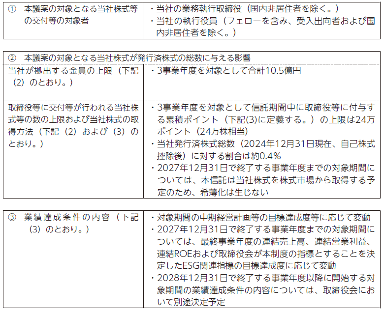 なお、本制度の詳細につきましては、2025年2月12日付適時開示「当社取締役等に対する株式報酬制度の継続および一部改定に関するお知らせ」をご参照ください。