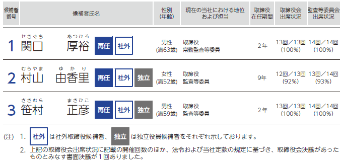 社外取締役候補者のうち村山由香里氏および笹村正彦氏は、当社が上場する東京証券取引所の定めに基づく独立役員の要件および当社の定める「社外役員の独立性判断基準」を満たしており、両氏の選任をご承認いただいた場合、独立役員となる予定であります。