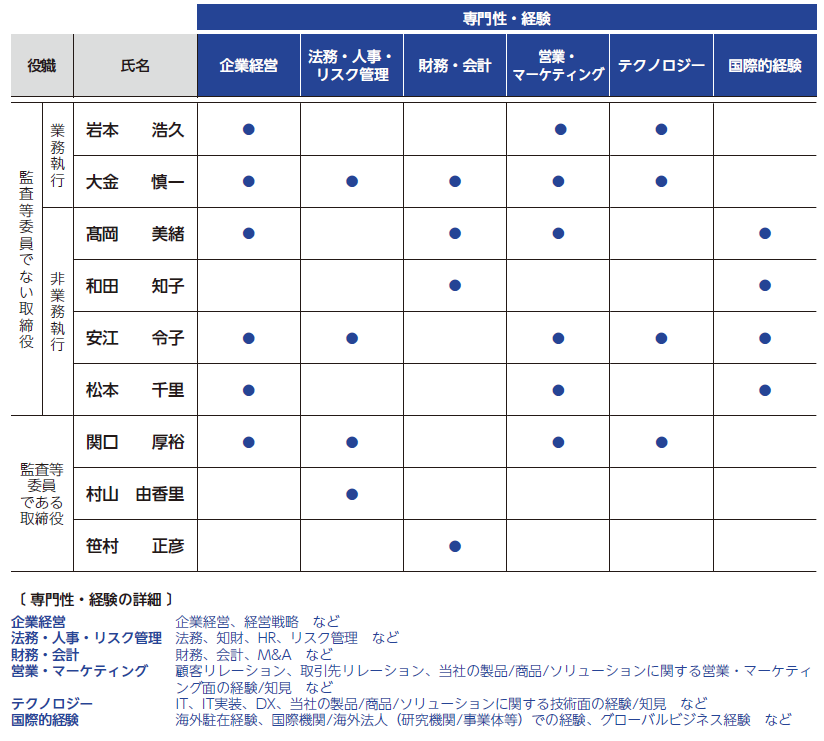 (1)経営、法律、財務・会計、情報技術、コーポレートガバナンス、リスク管理等の分野における豊富な経験または専門的な知識を有すること
