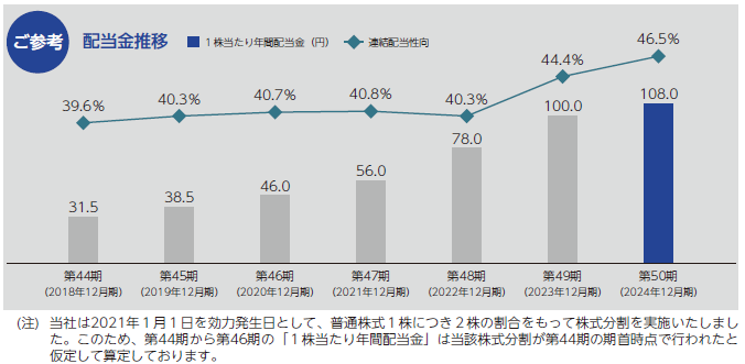 すでに実施済みの中間配当金1株につき54円とあわせまして、年間配当金は前期比8円増額の1株につき108円、連結配当性向は46.5%(※)となります。