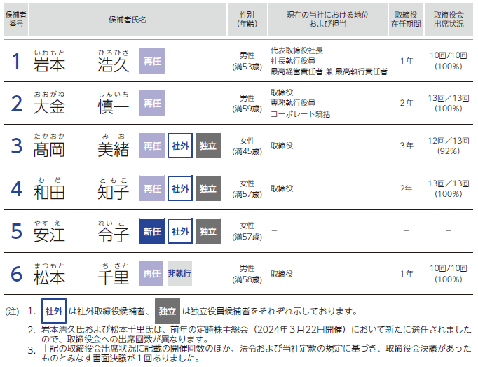 なお、社外取締役候補者3名はいずれも、当社が上場する東京証券取引所の定めに基づく独立役員の要件および当社の定める「社外役員の独立性判断基準」を満たしており、各氏の選任をご承認いただいた場合、独立役員となる予定であります。
