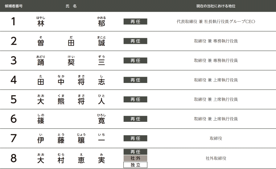 - ※9 当社は、取締役候補者大村恵実氏を、㈱東京証券取引所の定めに基づく独立役員として指定し、同取引所に届け出ており、同氏が再任された場合、引き続き独立役員となる予定であります。