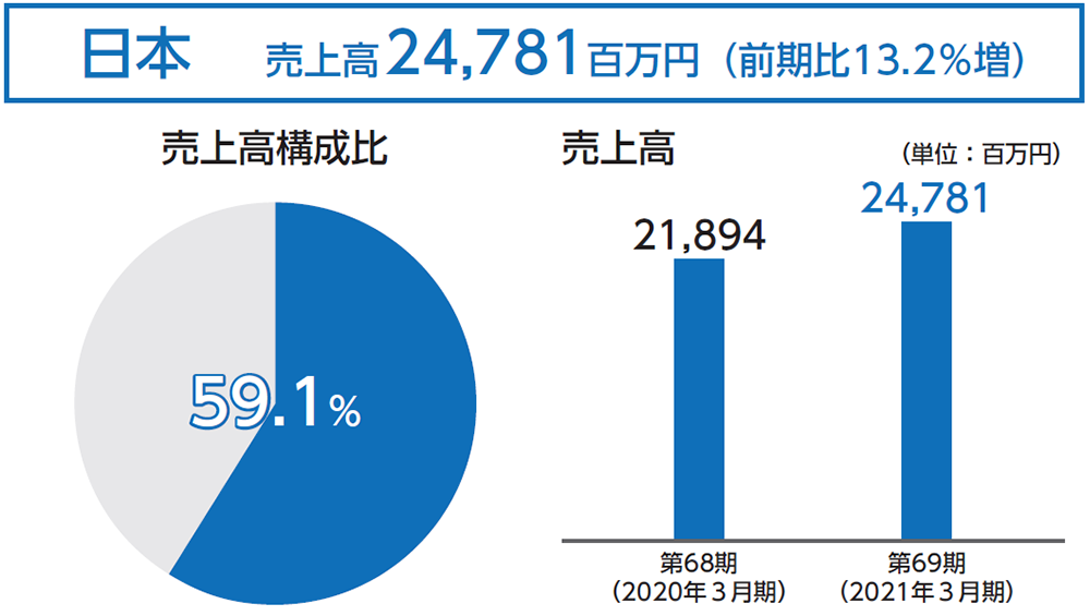 日本につきましては、最先端半導体デバイス向けCMP製品及びシリコンウェハー向け製品の販売が増加したことにより、売上高は24,781百万円(前期比13.2%増)、セグメント利益(営業利益)は売上増加に加え製品構成の良化により7,362百万円(前期比35.5%増)となりました。