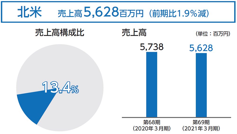 北米につきましては、売上高は5,628百万円(前期比1.9%減)となりましたが、セグメント利益(営業利益)は製品構成の良化により416百万円(前期比47.7%増)となりました。