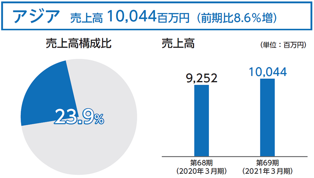 アジアにつきましては、最先端ロジックデバイス向けCMP製品の販売が好調に推移したことから、売上高は10,044百万円(前期比8.6%増)、セグメント利益(営業利益)は2,050百万円(前期比4.9%増)となりました。