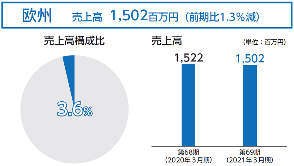 欧州につきましては、売上高は1,502百万円(前期比1.3%減)、セグメント利益(営業利益)は為替の影響もあり159百万円(前期比19.7%減)となりました。