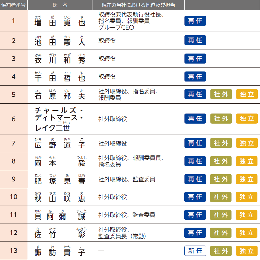 - 石原邦夫氏、チャールズ・ディトマース・レイク二世氏、広野道子氏、岡本毅氏、肥塚見春氏、秋山咲恵氏、貝阿彌誠氏及び佐竹彰氏は、㈱東京証券取引所が一般株主保護のため確保を義務付けている独立役員であります。また、諏訪貴子氏は㈱東京証券取引所が定める独立役員の要件及び当社の独立役員指定基準を満たしており、独立役員として同取引所に届け出る予定であります。