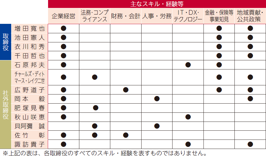 第2号議案のとおり取締役を選任いただいた場合の各取締役が有する主なスキル・経験等の分野は以下のとおりです。