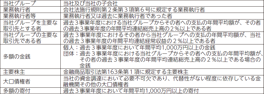 - 当社グループから多額の寄付を受けている者(当該寄付を受けている者が法人、組合等の団体である場合は、当該団体の業務執行者等又はそれに相当する者)