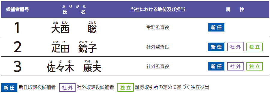 - 佐々木康夫氏は、現在、当社の社外監査役でありますが、監査役としての在任期間は、本総会終結の時をもって3年6カ月となります。
