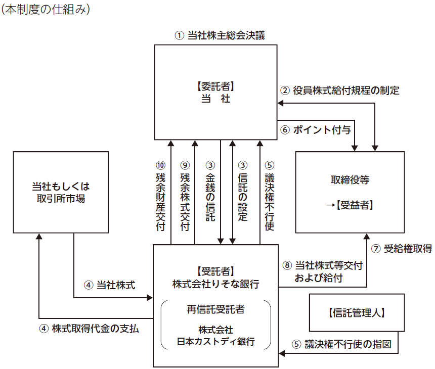 - ③当社は、上記①の当社株主総会で承認を受けた範囲内で金銭を信託し、本制度の対象者である取締役等を受益者候補とする信託(以下、「本信託」といいます。)を設定(委託者の地位を承継)しています。なお、本株主総会で承認を受けた範囲内で金銭を追加して信託することができるものとします。