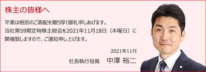 第59期定時株主総会におきましては、おみやげ(クーポン券、カレンダー、飲料等を含む)の配布は予定しておりません。何卒ご理解の程宜しくお願い申しあげます。 |