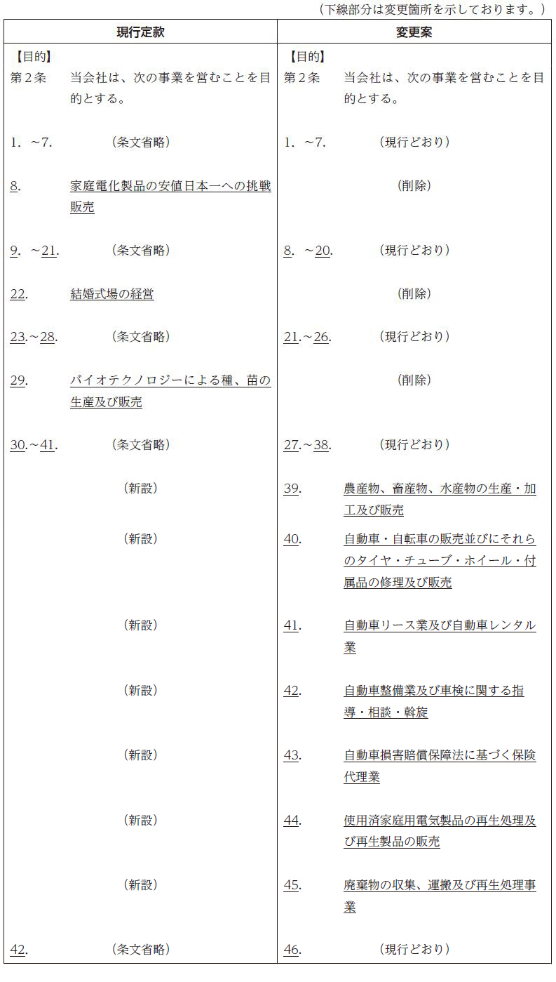事業内容の今後の多様化及び事業目的の明確化を図るため、現行定款第2条(目的)について事業目的の追加、削除及び記載内容の一部変更を行うものであります。