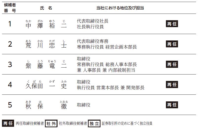生年月日 1969年8月4日生 略歴、地位及び担当並びに重要な兼職の状況 1991年10月 当社入社2009年11月当社情報システム本部長2011年10月当社情報システム本部長兼経営企画室長2012年 6月当社執行役員経営企画室長兼情報システム本部長2012年11月当社執行役員経営企画本部長2013年11月当社取締役執行役員経営企画本部長2018年 9月当社取締役常務執行役員経営企画本部長2020年 9月当社代表取締役専務専務執行役員経営企画本部長(現任)所有する当社の株式数 25,600株 在任年数 11年(本株主総会終結時) 取締役会出席状況 18/18回 取締役候補者とした理由 荒川忠士氏は長年にわたり、システム部門及び経営管理、経営戦略策定の責任者を務め、2013年11月に当社取締役、2020年9月より当社代表取締役として会社経営に携わり、当社の中で培った豊富な経験・実績・見識を有しております。その見識等を経営に活かすことを期待し、取締役候補者といたしました。 -