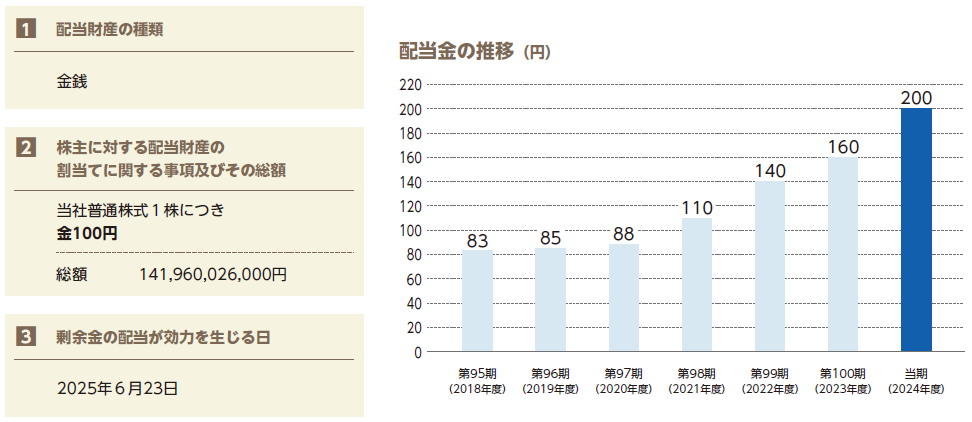 当社は、実額ベースでの着実な配当の充実を重視することにより株主還元の充実を図る方針です。2024年度の株主配当金(中間配当金100円を含む)は、当社史上最高を更新する200円とし、期末配当金につきましては100円といたしたく存じます。