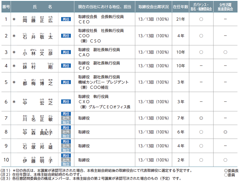 2025年3月31日付で取締役の瀬戸憲治氏が辞任されました。また、本株主総会終結の時をもって、取締役の岡藤正広、石井敬太、小林文彦、鉢村剛、都梅博之、中宏之、川名正敏、中森真紀子、石塚邦雄、伊藤明子の各氏、計10名の任期が満了となります。つきましては、取締役10名の選任をお願いするものです。その候補者は次のとおりです。なお、取締役候補者10名のうち、4名を社外取締役候補者とします。