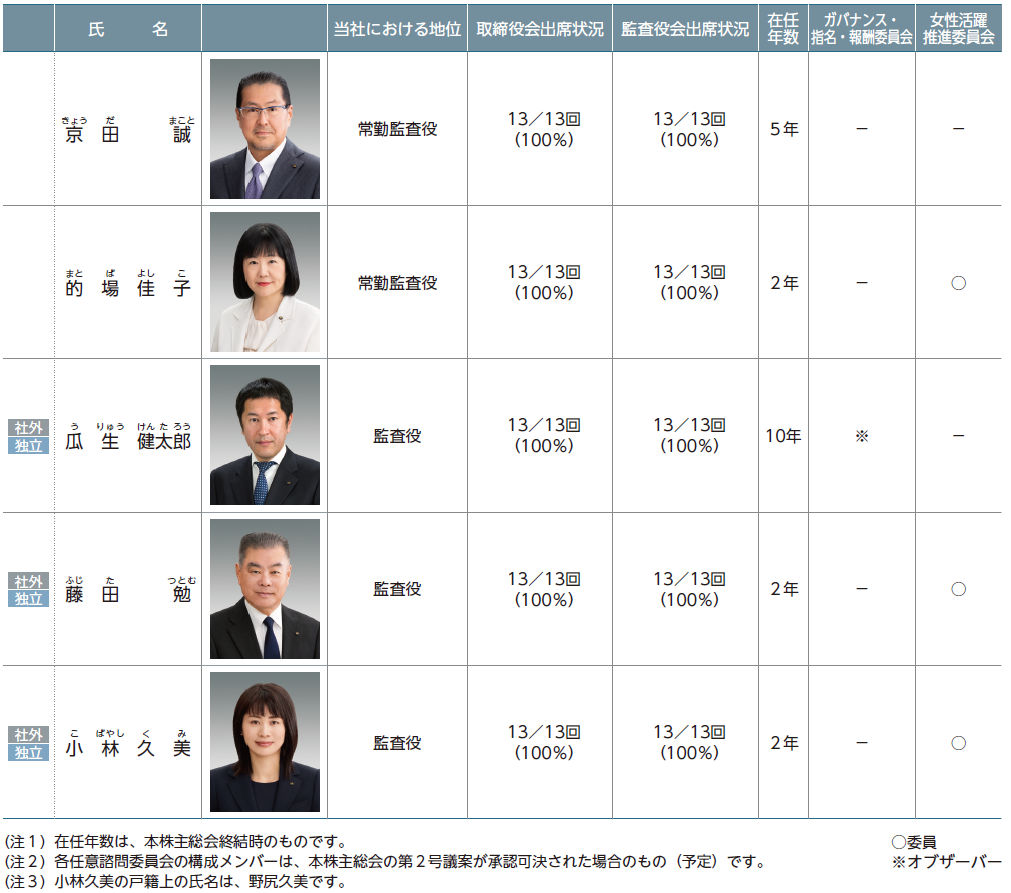 - (注2) 各候補者が所有する当社の株式数には、内数として表示している株式報酬制度に基づき交付される予定の株式数(業績連動型株式報酬制度における権利確定済み株式報酬ポイント数、本株主総会の第3号議案が承認可決された場合の付与予定株式報酬ポイント数及び支給予定株式数)を含めて表示しています。当社の取締役報酬制度の概要は、事業報告「3.(3)取締役及び監査役に対する報酬等」をご参照ください。