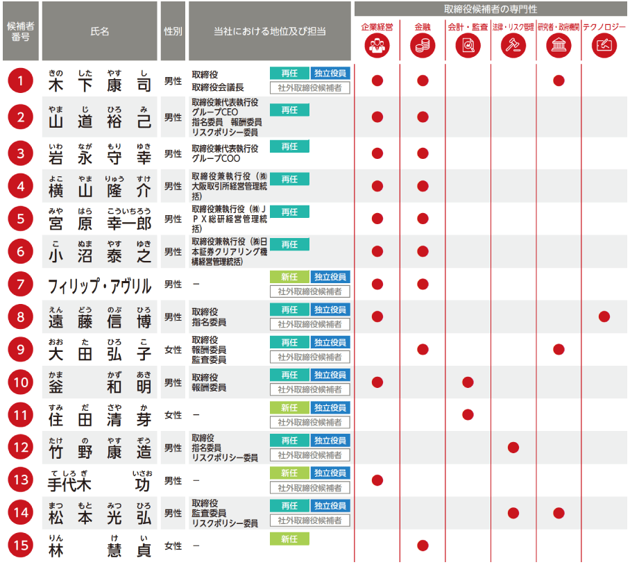 - 各取締役候補者の当社株式所有数には、日本取引所グループ役員持株会名義の実質所有株式数のうち、売買単位相当の持分が含まれています。